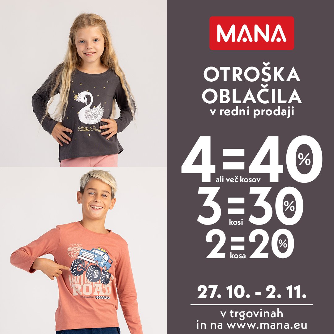 MANA je mednarodno podjetje, ki v svoji prodajni ponudbi zajema oblačila za vso družino in nekatere pripomočke za dom. Trgovina s svojo modno ponudbo, vrhunsko kakovostjo in ugodnimi cenami že leta zadovoljuje potrebe številnih družin. Maloprodajna mreža MANA se nenehno razvija po vsej Sloveniji in svojim kupcem ponuja najvišjo kakovost izdelkov in storitev po dostopnih cenah.